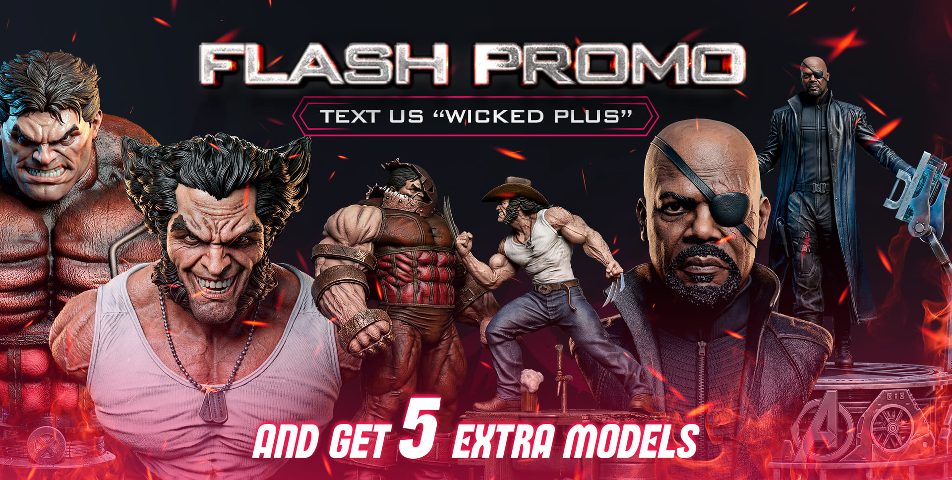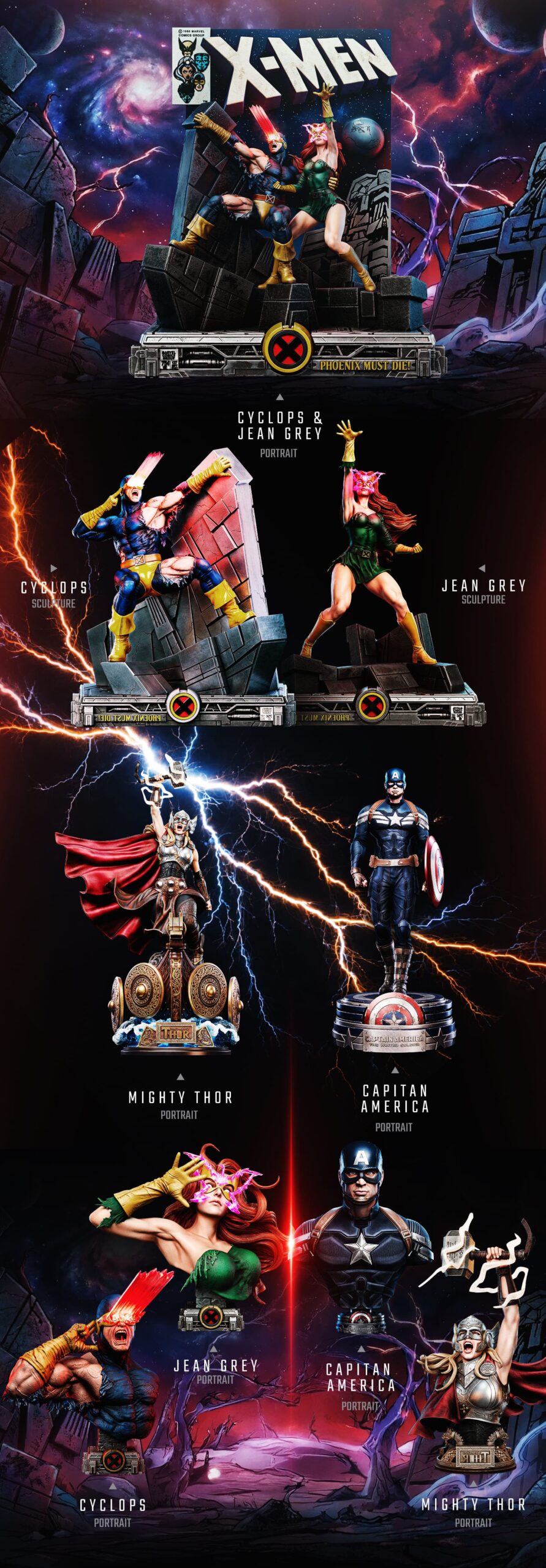 19 models total: 9 Comics (1 diorama, 4 sculptures, 4 busts), 5 Movies (1 diorama, 2 sculptures, 2 busts) and 5 Videogames (1 diorama, 2 sculptures, 2 busts) — plus extra surprises, promos and loyalty terms.
